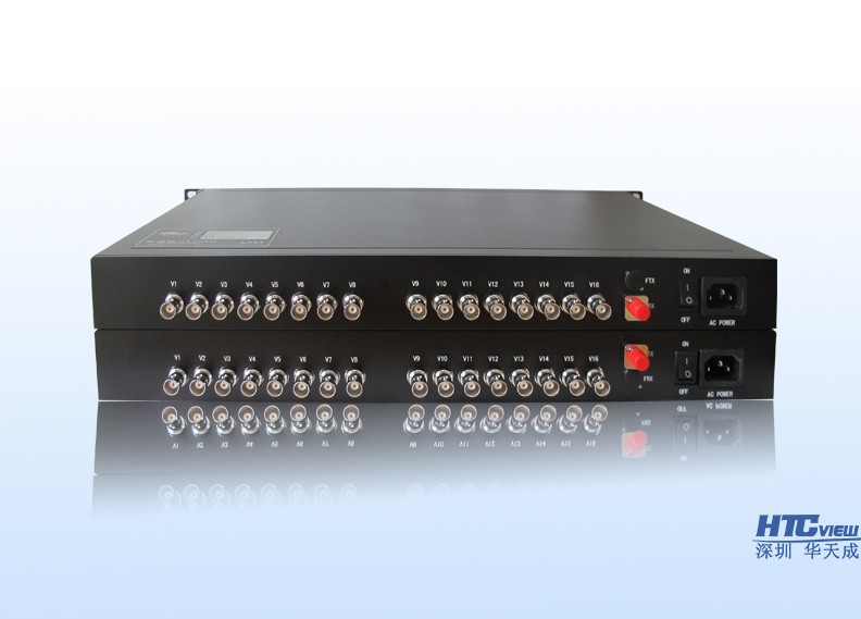 HTCVIEW16路视频光端机采用国际最先进的数字及千兆光纤高速传输技术,将16路视频及多路RS-232/485/422数据、电话语音、以太网等信号在单芯或双芯光纤上无失真、高质量远距离传输的作用。