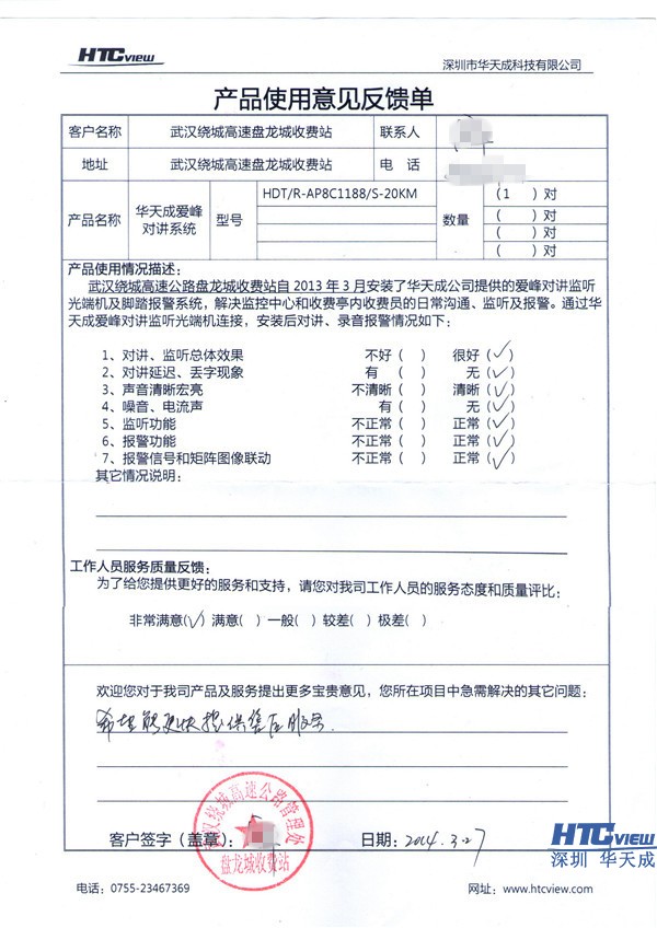 爱峰对讲光端机产品使用意见反馈单: